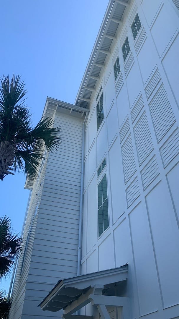 This exquisite multi-story home in Santa Rosa Beach was upgraded with beautiful Galvalume Half Round 6-inch seamless gutters to perfectly match its design!