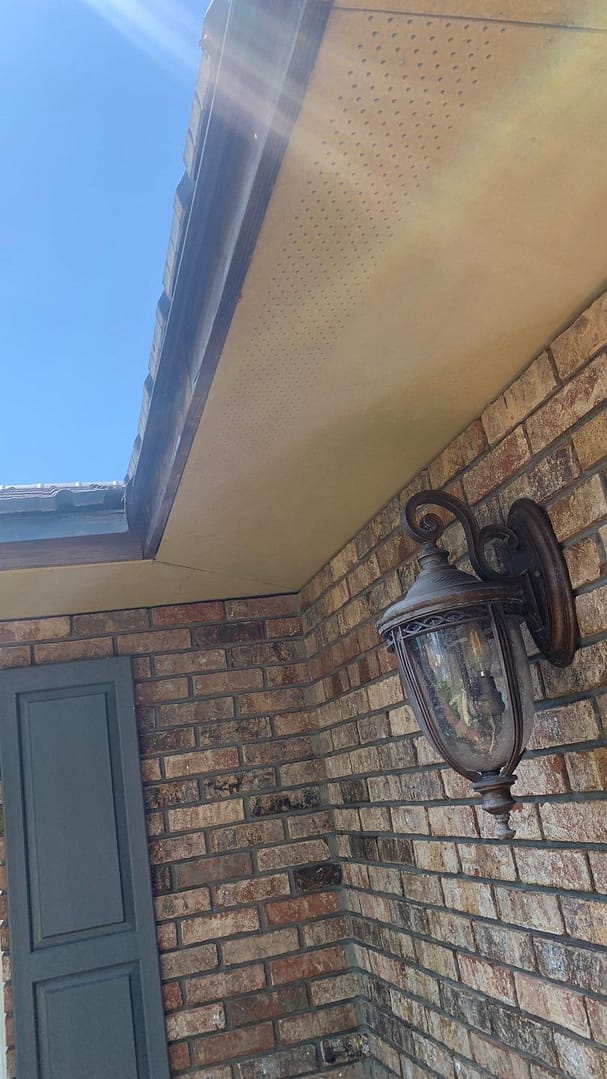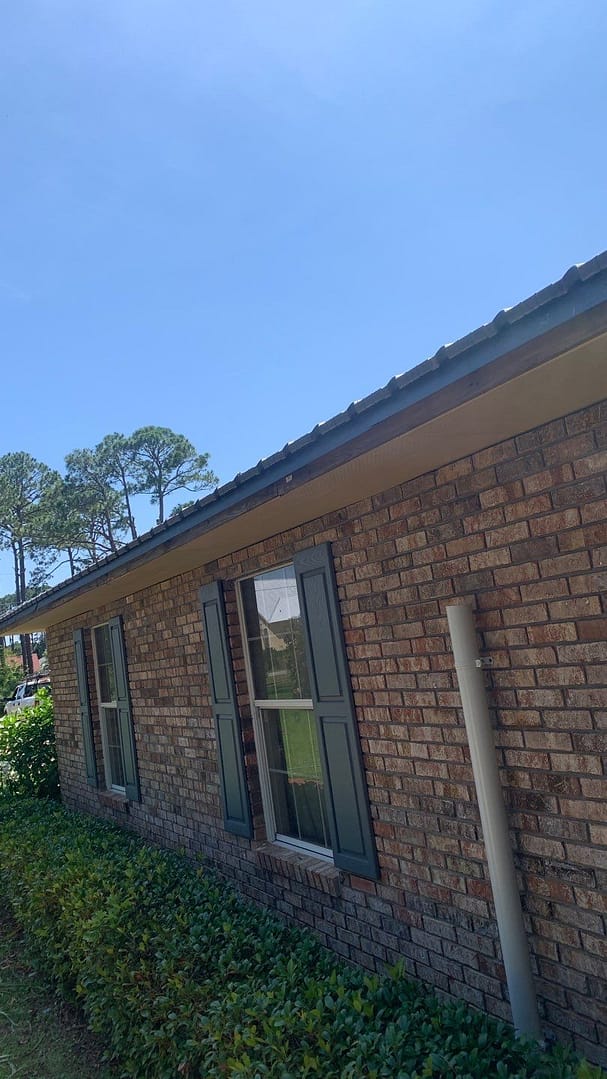 The soffit and fascia on this pretty waterfront brick home located in Miramar Beach had taken some storm damage. We removed the old and replaced it with a brand new set of vented vinyl soffits and fascia to match!